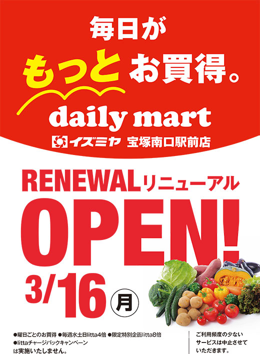 このたび、イズミヤ デイリーマート宝塚南口駅前店は、「毎日がもっとお買い得。」をコンセプトに、地域の皆様にこれまで以上に愛される店として、リニューアルオープンいたします!